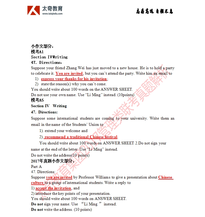 祝贺太奇教育2017管理类联考英语大小作文直接命