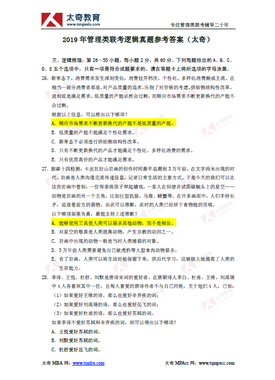 太奇教育考后结合多位权威名师深度解析真题变化、分析答案要点,发布2019年管理类联考考研真题答案及解析大汇总,帮助考生做好考后估分、迎战后续调剂复试!
