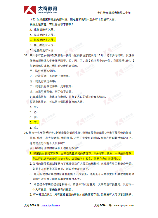2019年管理类联考综合能力逻辑真题及参考答案(5)