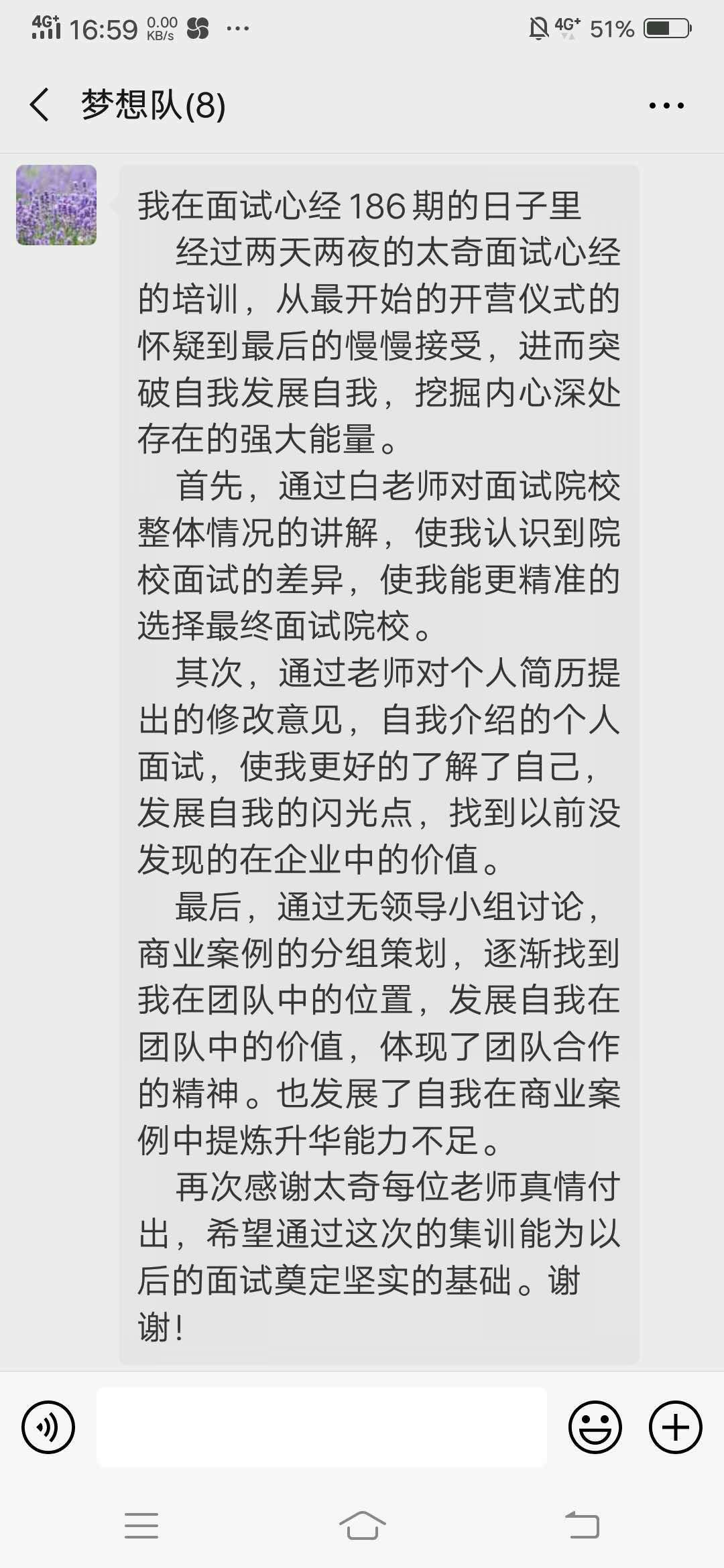 2020年MBA提前面试备考已经开始了,打响名校名校第一批次MBA提前面试先发之战,太奇2020年第一期面试集训营(186期),也在上个周末圆满的结束!通过两天两夜科学的名校MBA面试辅导,多位太奇资深MBA面试教辅官实战性培训,完美收获所有参训学员高度认可——2020年冲击名校MBA提前面试,打响先发之战,就得像太奇这么辅导!