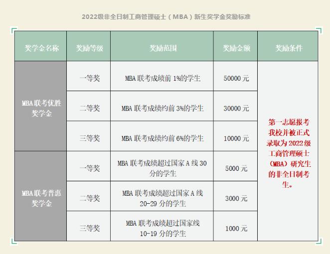 为了鼓励优秀人才攻读非全日制工商管理硕士(MBA),培养更多品学兼优的商界精英,北京交通大学MBA教育中心特设立MBA联考优胜奖学金、MBA联考普惠奖学金。其奖励范围、奖金额度和奖励对象如表三所示。若有变动,均以具体通知为准。