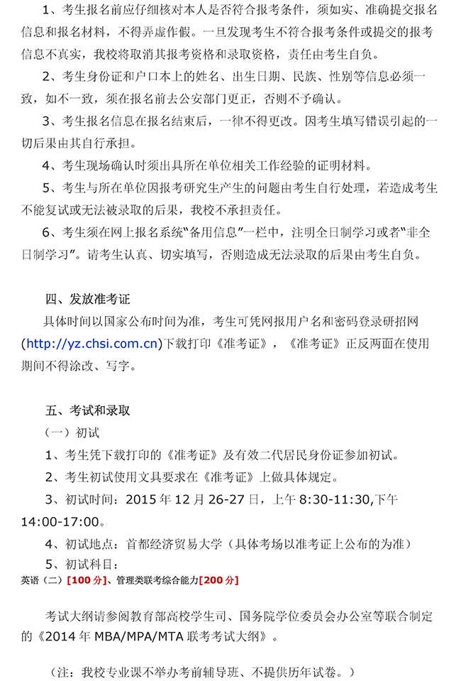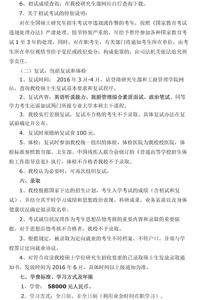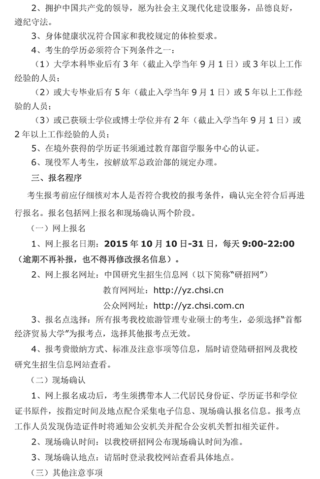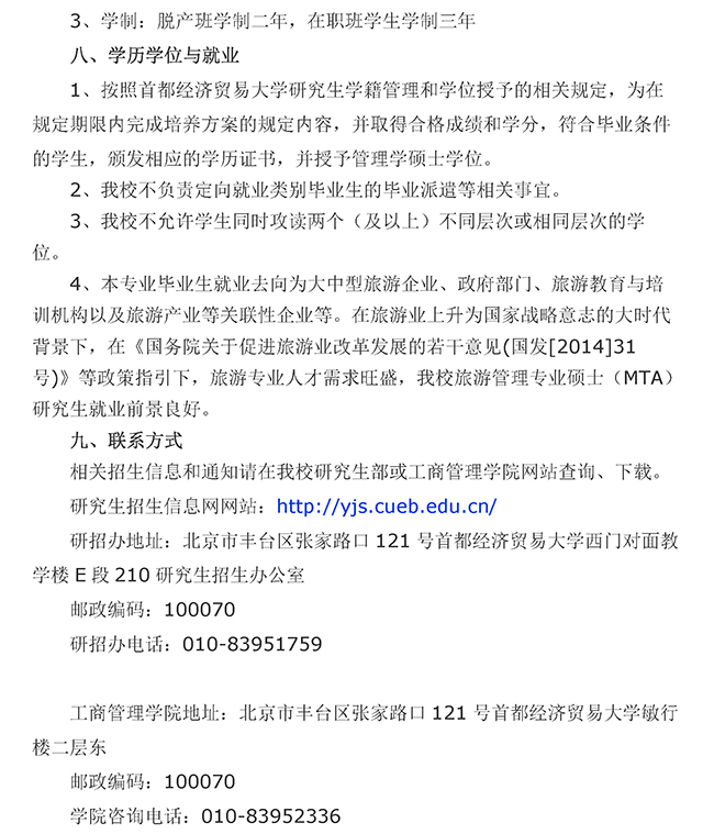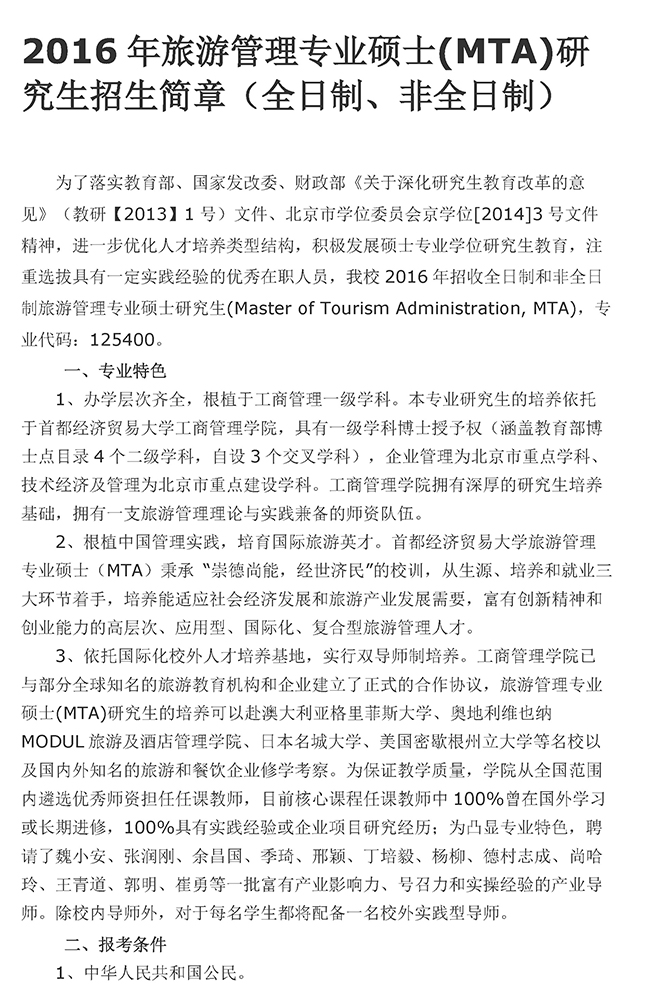 首都经济贸易大学旅游管理硕士(MTA)招生简章