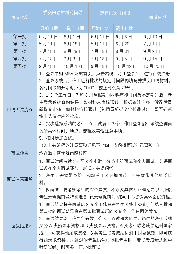 如果在提交材料截止日期前,该批次面试名额已满,考生仍然可以提交材料,审核老师也将审核完所有在截止日期前提交的材料。这样,审核通过的考生,在下一批次提交材料时间段的第一天起即可选择该批次;审核未通过的考生,也可在下一批次提交材料时间段的第一天起即可重新提交审核。但如果最后一个批次,即第四批,在提交材料或者选择批次的截止日期前,面试名额已满,MBA中心将在官网发布通知,提醒考生提前批面试申请已提前结束。届时,材料未提交、材料审核未通过、材料审核已通过但未选择批次的考生,都将无法参加提前批面试,但可在联考成绩上了中财MBA复试线后,参加正常批面试。