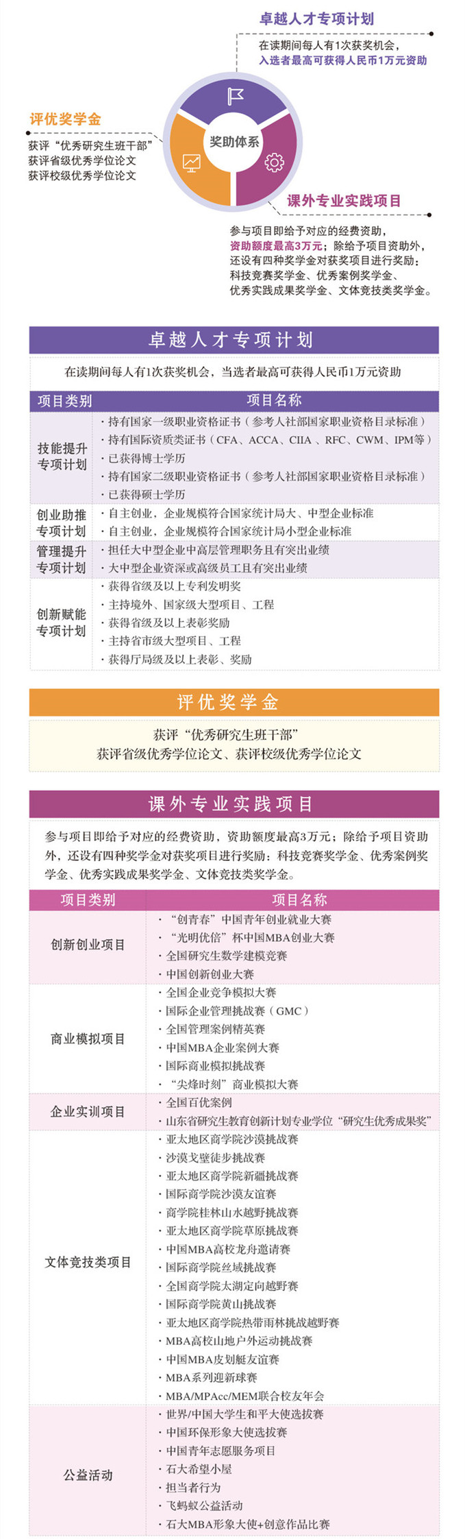 2015年学校MBA项目以优良的成绩通过教育部合格评估。2016年参加全国首次专业学位水平评估,在第八、九批100余所MBA培养高校中位居前列,在山东10所MBA培养高校中位列前三。2020年学院获评“最具特色MBA项目”、“中国商学院卓越运营奖”等。2021年MBA研究生陶付文荣获全国五一劳动奖章,王军会老师入选中国注册会计师协会第二期会员培养(高端班)项目,是该期高端班35位注册会计师会员中唯一一位来自高校的入选者。